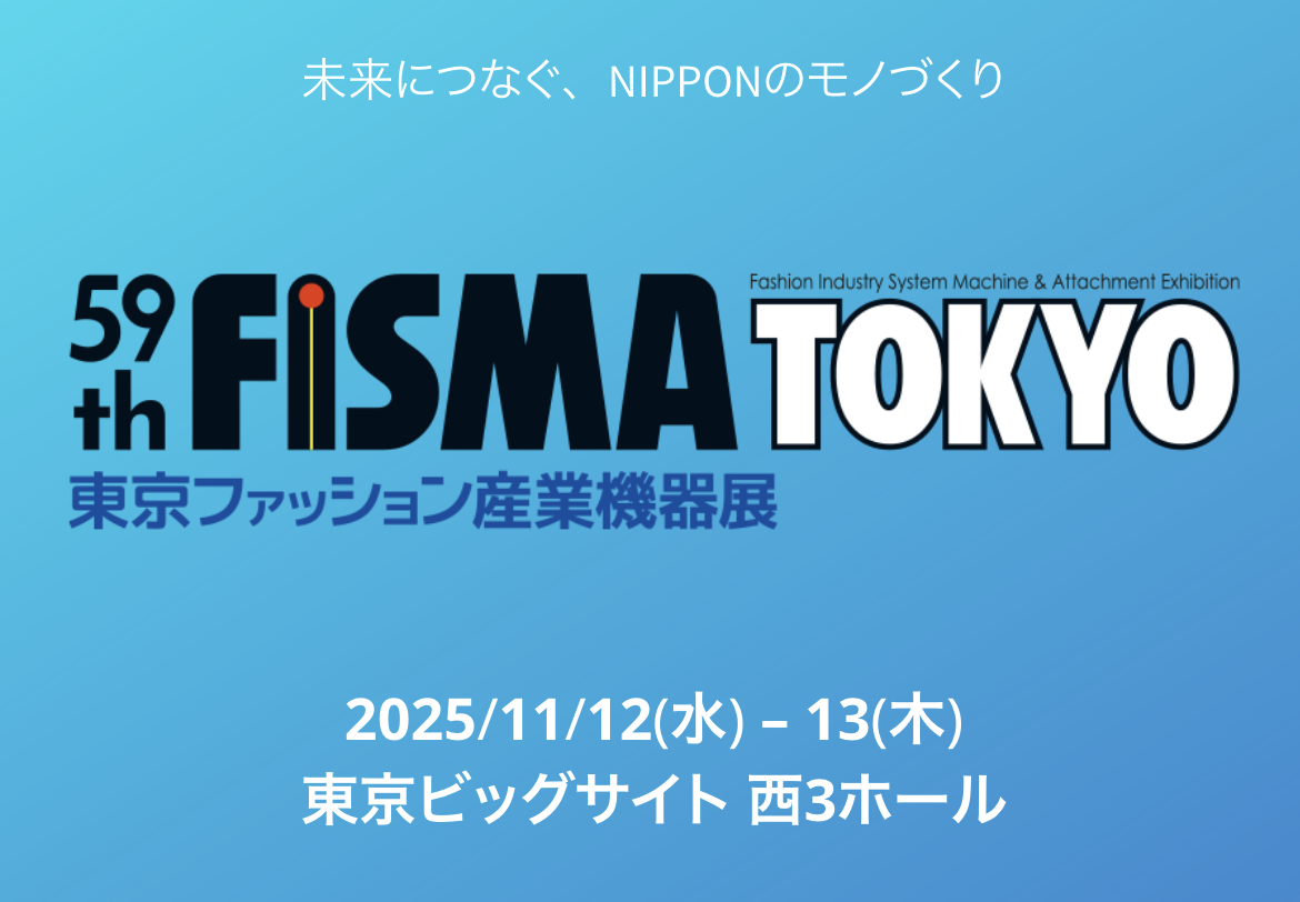 10月17・18日 2025九州アパレルマシンショー 場所:地場産くるめ(久留米地域地場産業振興センター) 1F 会場案内は <こちら>をご覧下さい。 11月12・13日 FISMA展示会 場所:東京ビッグサイト 詳細は <こちら>をご覧下さい。